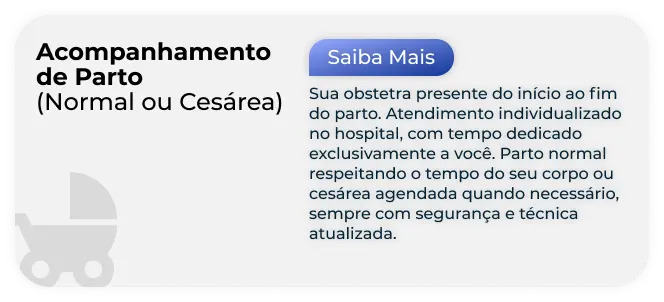 Estarei presente do início ao fim do seu parto, seja normal ou cesárea. Após o nascimento, fazemos avaliação pós-parto ainda no hospital e agendamos consulta de retorno.